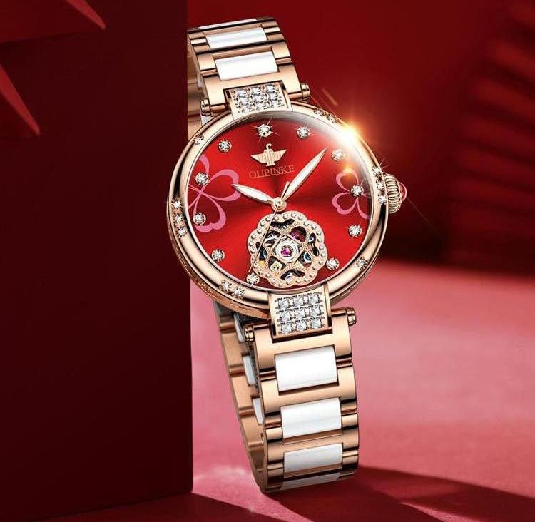 • Skeleton Tourbillon Movement: A meticulously crafted tourbillon mechanism within a skeleton design, showcased in an elegant four-leaf clover motif for both charm and precision.