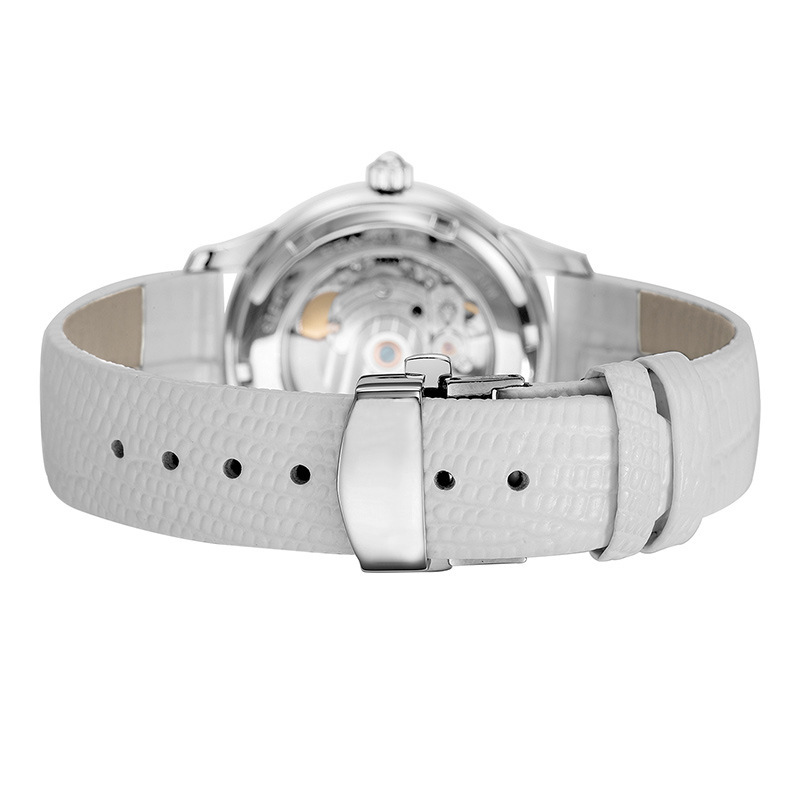 The dial is inlaid with high-quality moissanite, dazzling and luxurious, enhancing the overall appeal of the watch. The unique mother-of-pearl dial offers a distinctive luster and color, making each glance a highlight. The strap is made from genuine leather, providing both comfort and style for everyday wear.