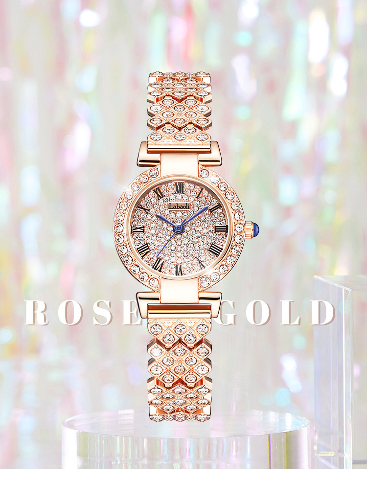 This full diamond moissanite 18K rose gold vintage style women's watch perfectly blends classic elegance with modern flair, designed for the sophisticated woman. The dial measures 26x26MM with a thickness of 10MM, providing a lightweight design at only 43G, making it comfortable for everyday wear.
