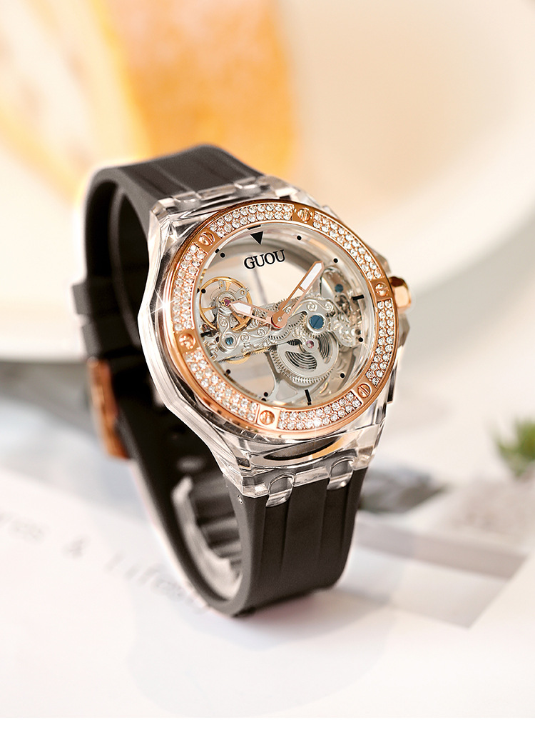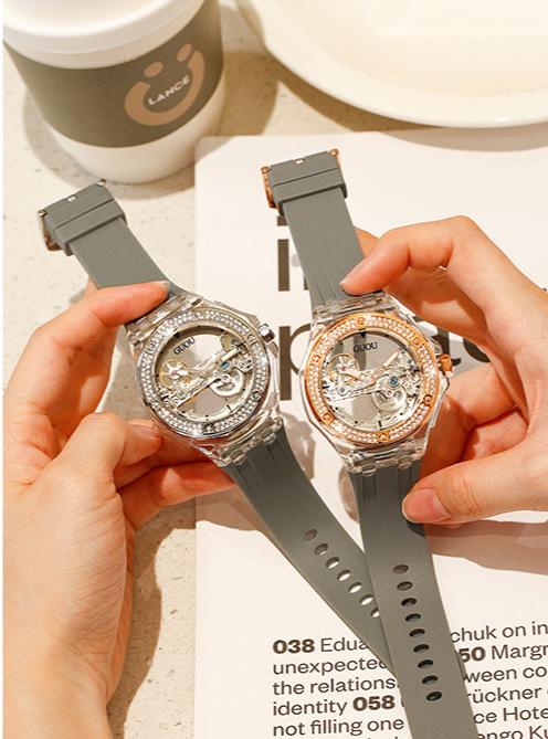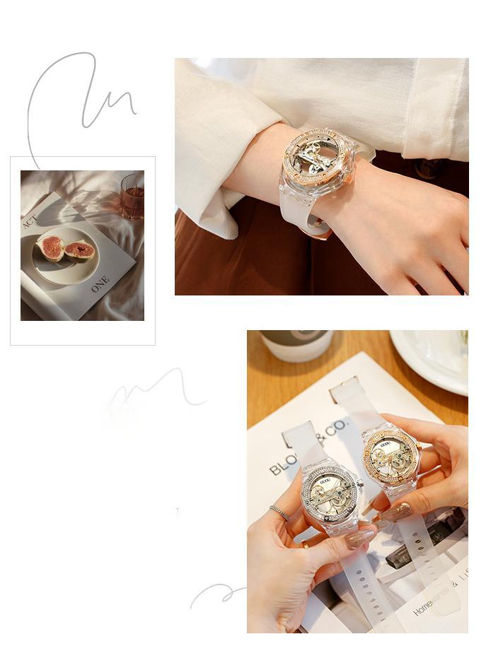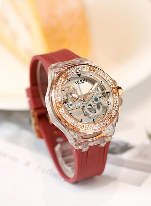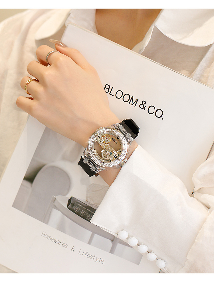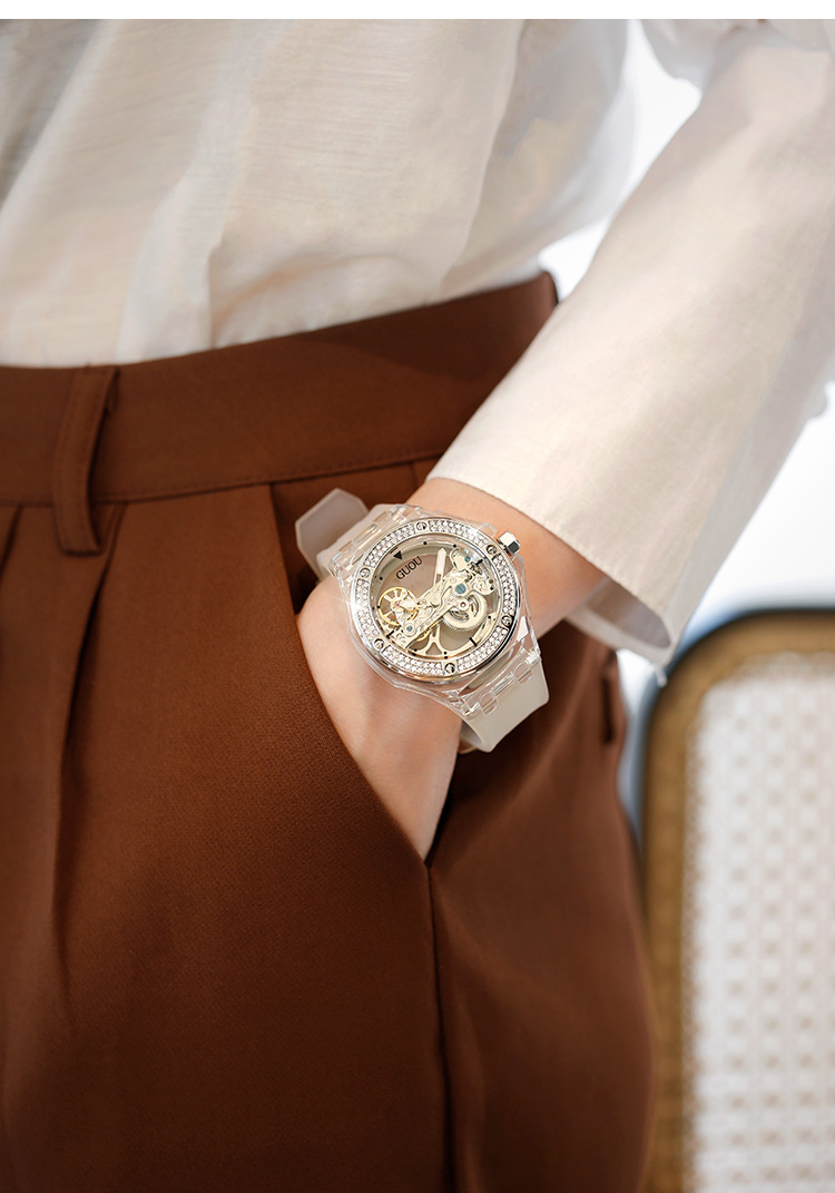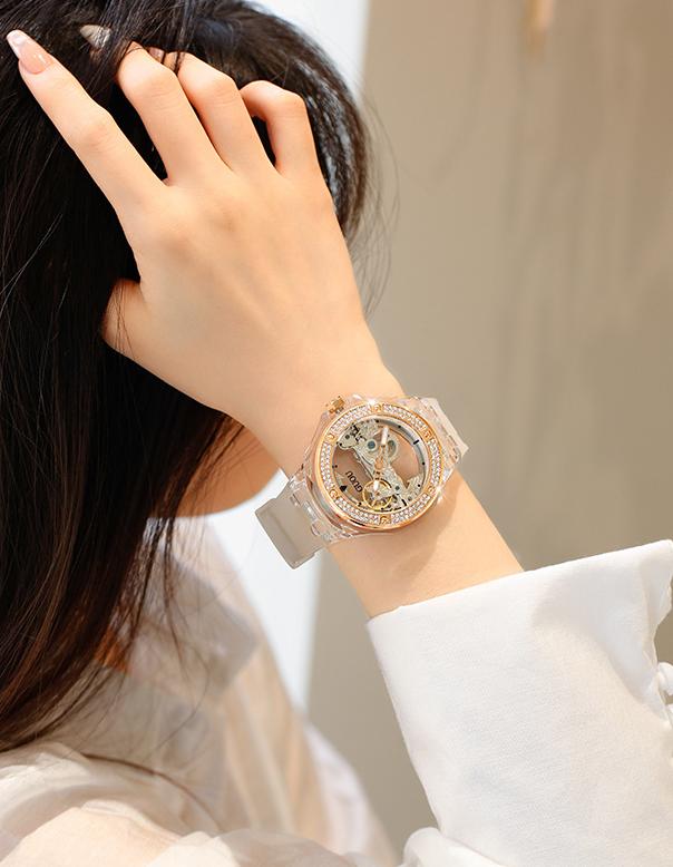 This elegant minimalist women's mechanical watch stands out with its unique transparent skeleton design, giving wearers a combination of sophistication and modern style. The intricate inner workings of the movement are visible through the beautifully crafted newspaper-inspired skeleton dial, showcasing exceptional craftsmanship and a striking visual appeal. The watch features a scratch-resistant sapphire crystal, ensuring a polished, clear look even after extended use.
