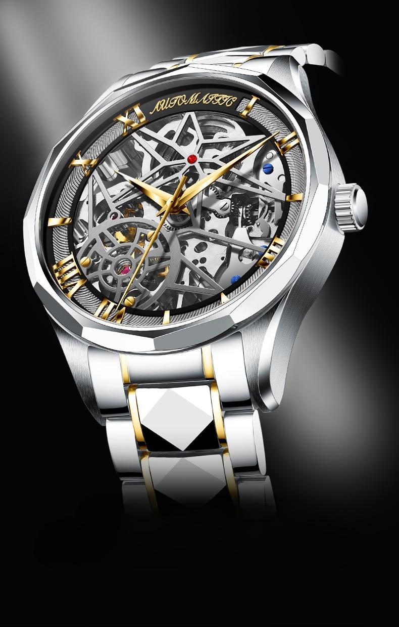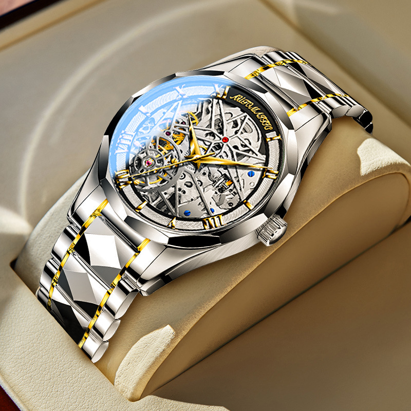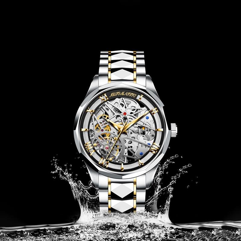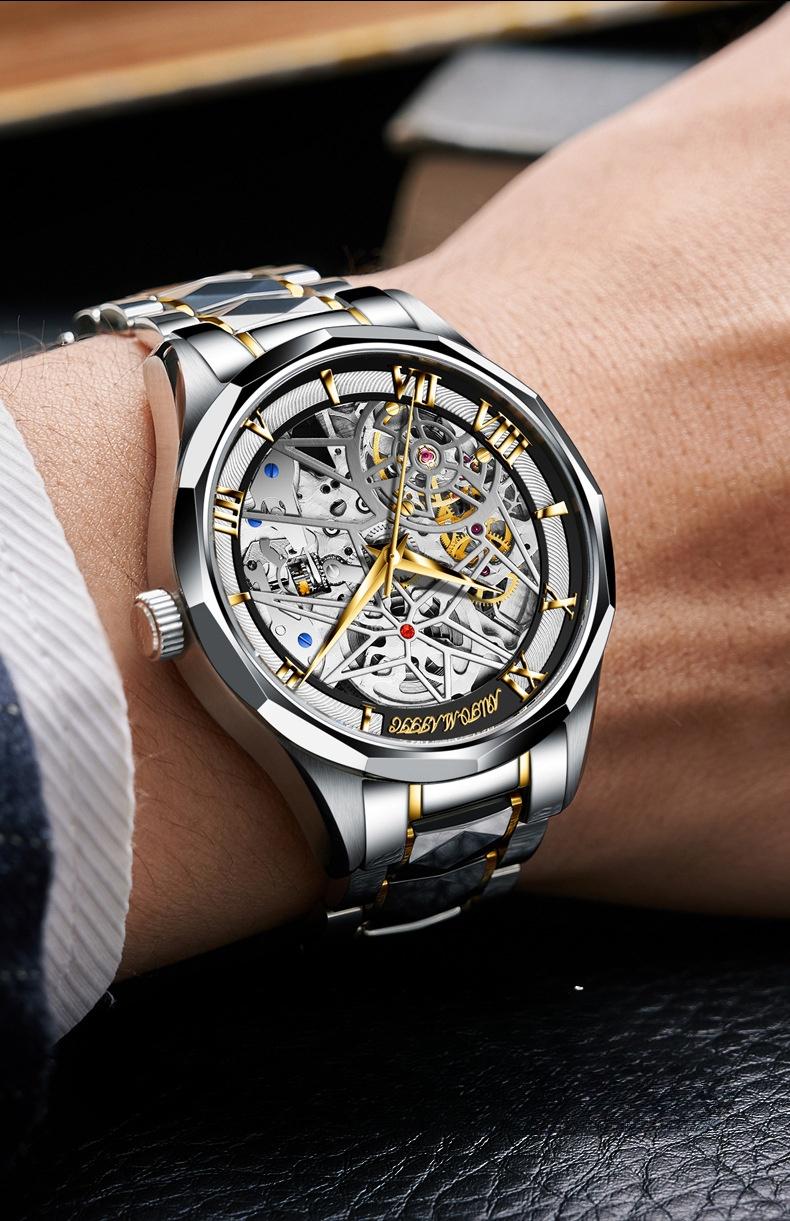 This watch perfectly combines modern technology with traditional craftsmanship, showcasing a sleek yet intricate design. The 41mm dial features a double-sided skeleton design, revealing the precise workings of the upgraded automatic movement. The scratch-resistant mineral glass ensures lasting clarity, while the reinforced sapphire dial provides extra durability. With a 12.6mm thickness and a 20mm wide tungsten steel strap, the watch is secured by a butterfly clasp, adding both convenience and elegance. Weighing 152.5g, it feels solid and comfortable to wear.