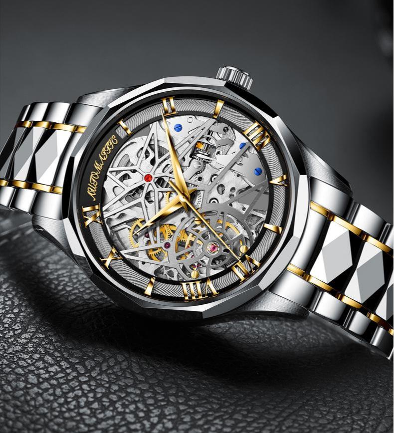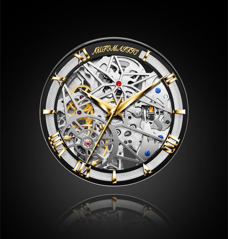 - Double-sided skeleton design for showcasing mechanical precision